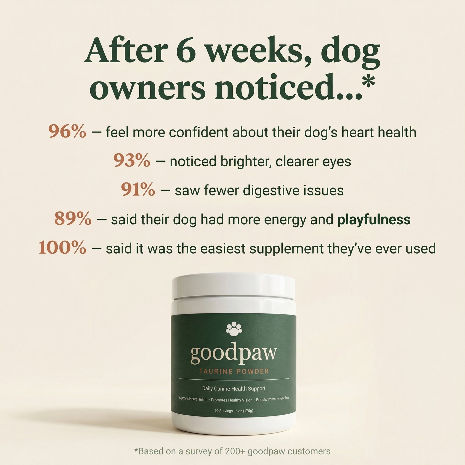 Taurine is an amino acid — think of it as fuel for your dog's heart, eyes, and gut. The heart has more taurine in it than almost anything else. Without enough, the heart weakens, vision can decline, and digestion suffers. Most dogs don't get enough from food alone, which is why supplementing matters.